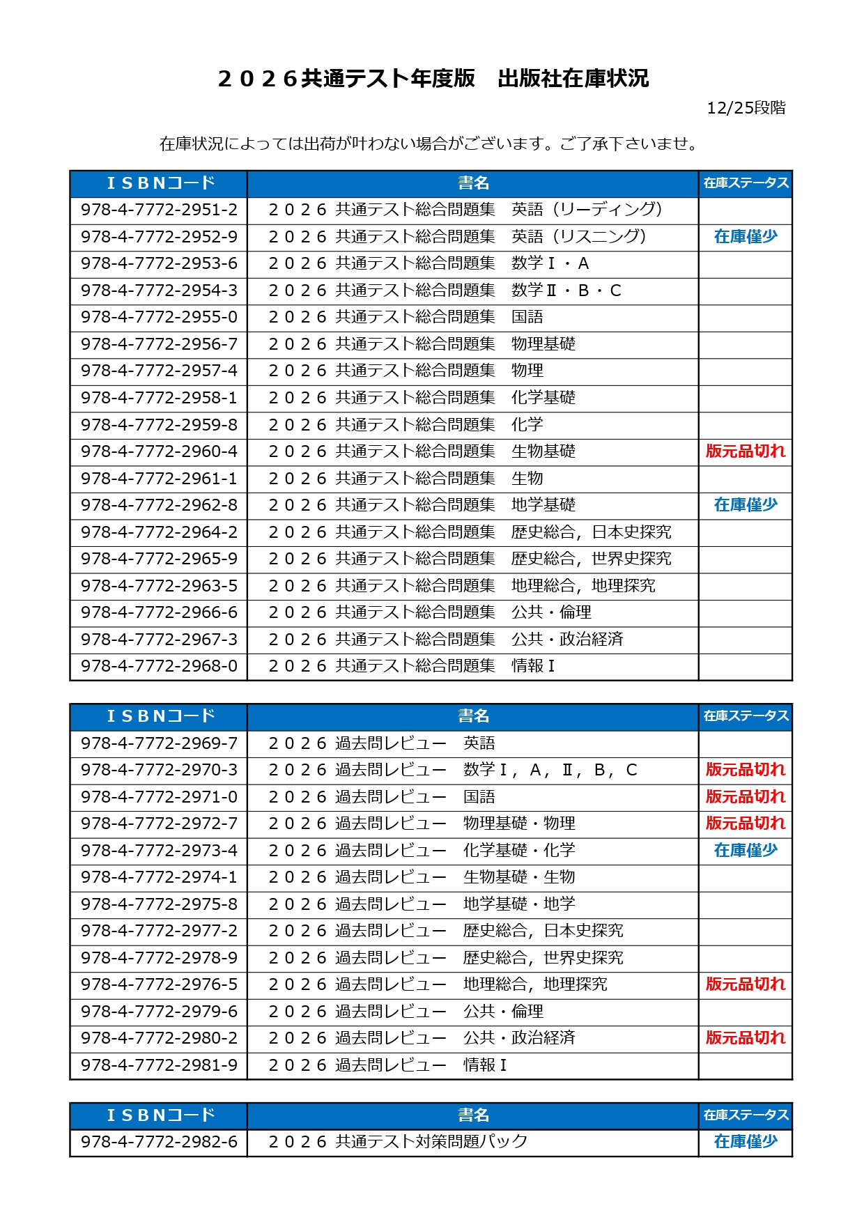 12/25(木)現在の「2026共通テスト総合問題集」および「2026過去問レビュー」の在庫状況についてお知らせいたします。